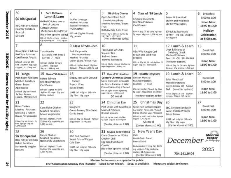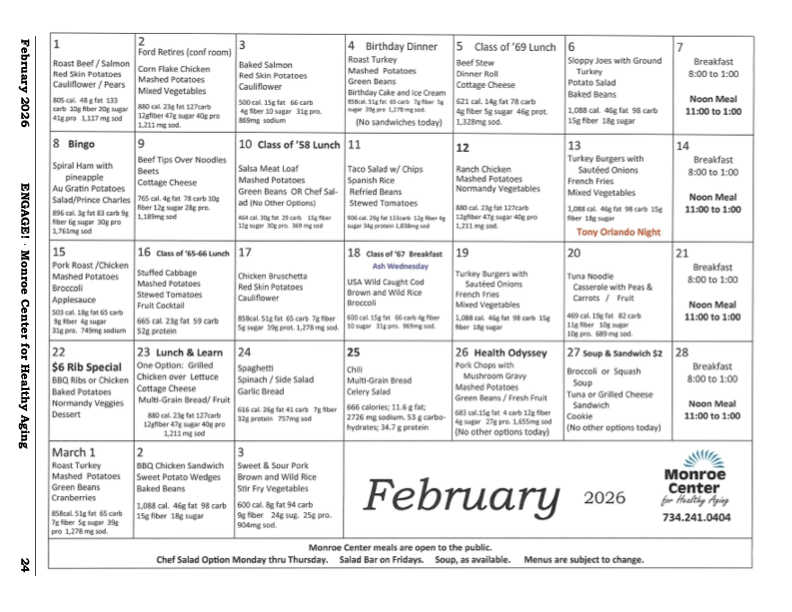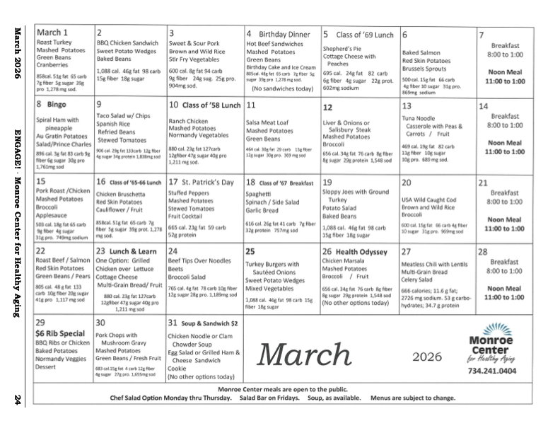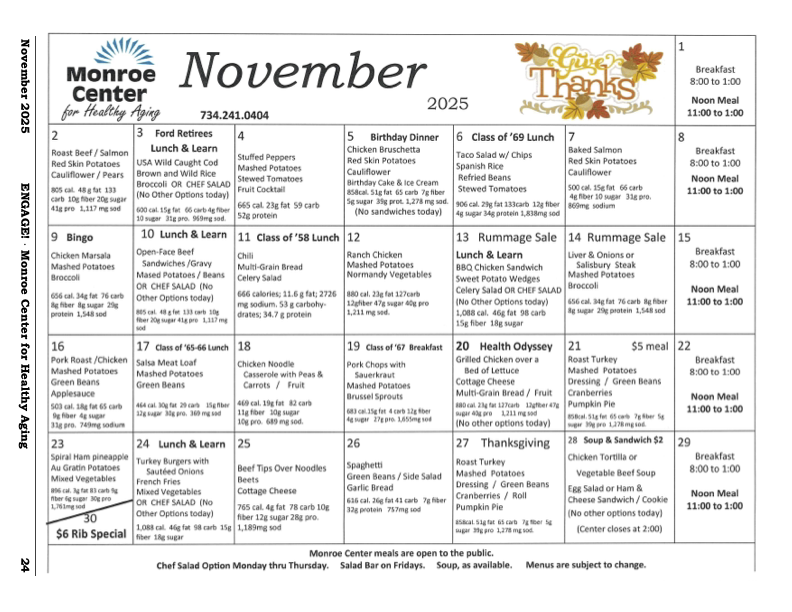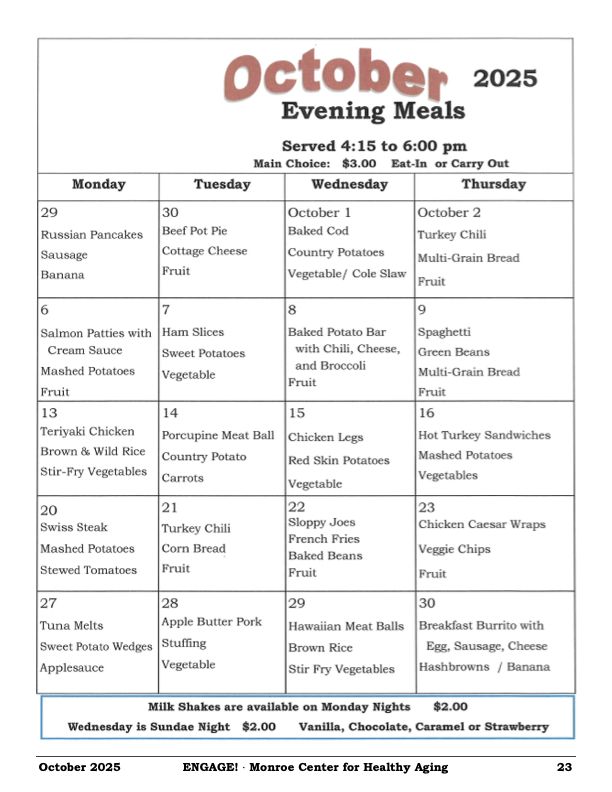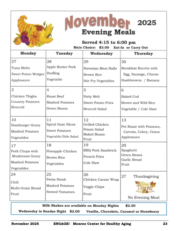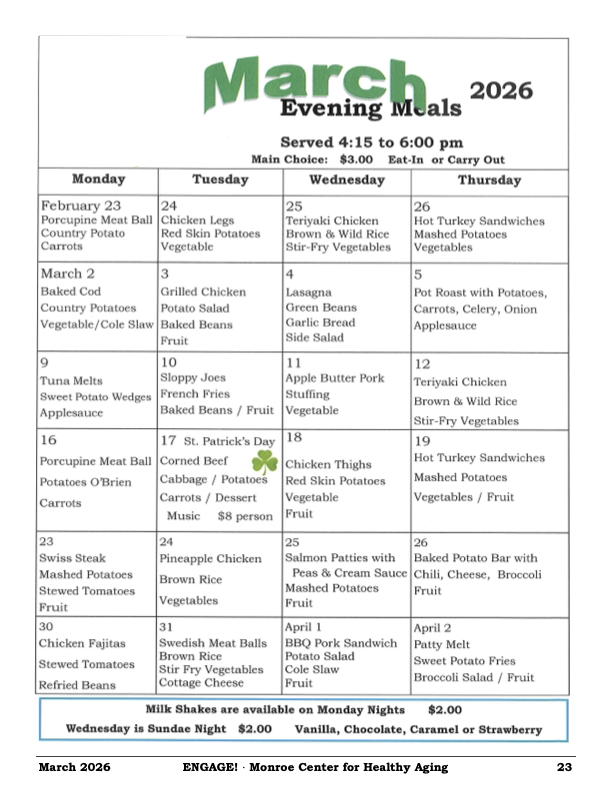 Eating at the Cafe' is easy as 1, 2, 3! The Center has daily specials, along with a full breakfast and lunch menu Monday through Saturday, with a homestyle dinner prepared on Sunday. The moonthly menu can be found on the last page of the newsletter under the Newsletter tab.