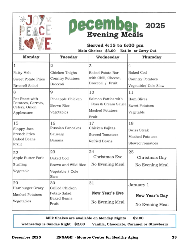 Evening meals are served Monday - Thursday from 4:15-6:00 pm.