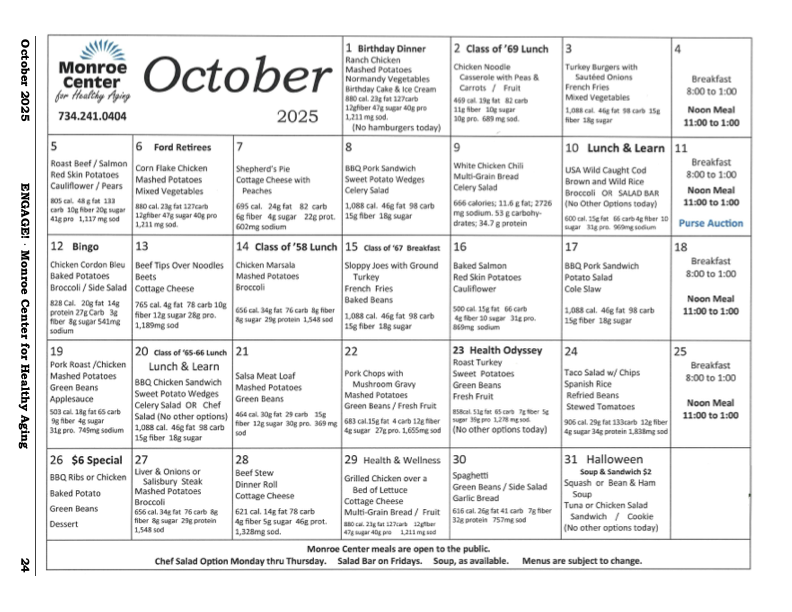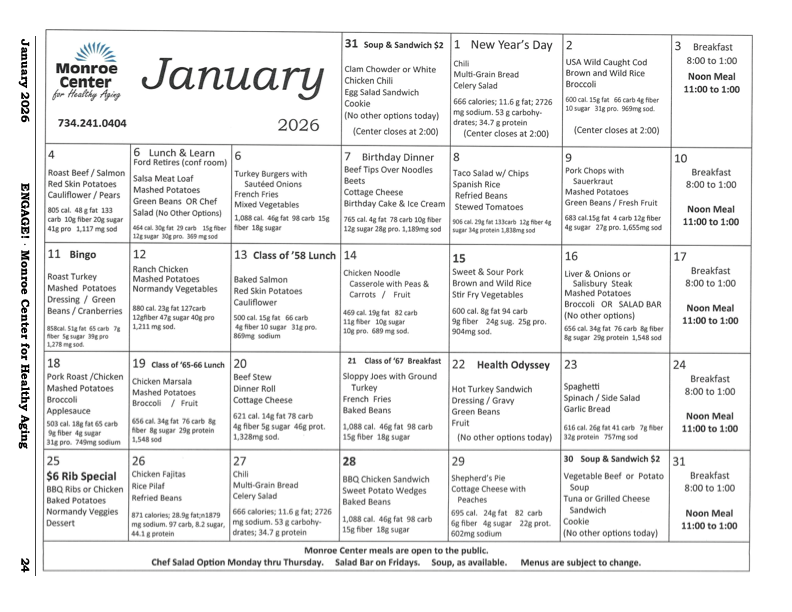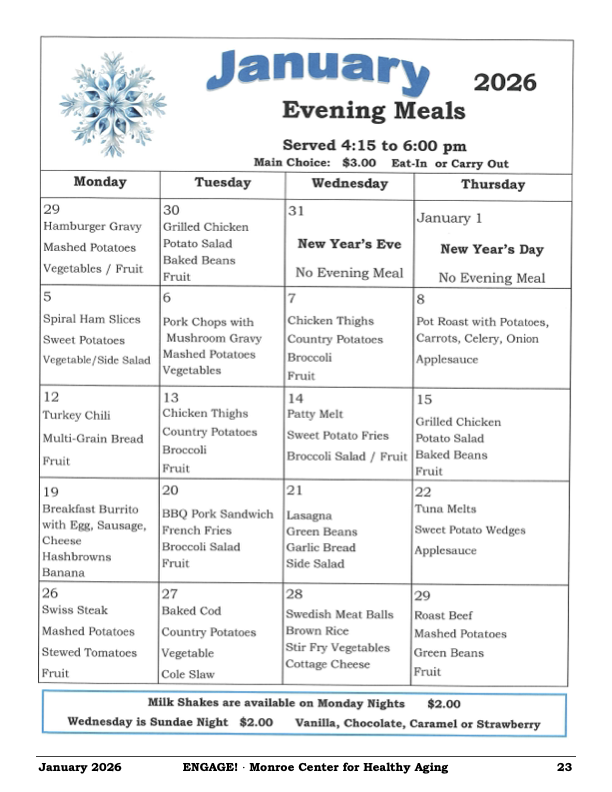 Eating at the Cafe' is easy as 1, 2, 3! The Center has daily specials, along with a full breakfast and lunch menu Monday through Saturday, with a homestyle dinner prepared on Sunday. The moonthly menu can be found on the last page of the newsletter under the Newsletter tab.